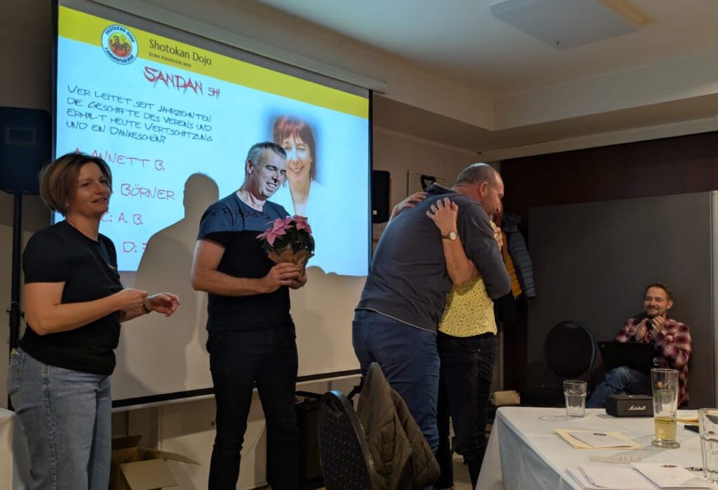 Ein ganz besonderer Anlass zum Feiern war in diesem Jahr das 35-jährige Vereinsjubiläum des Shotokan Dojo Jena e.V.. Am Samstagabend erwartete uns ein abwechslungsreiches Programm mit rückblickenden Berichten zu wichtigen Meilensteinen der Vereinsgeschichte, begleitet von einer stimmungsvollen Diashow. Die vielen gemeinsamen Aktivitäten und Erfolge machten deutlich, wie lebendig und engagiert sich unser Verein über die Jahre entwickelt hat.